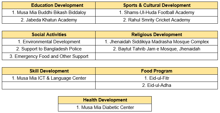 Some of the significant activities of the foundation include large scale food distribution programs in Jhenaidah and other parts of the country organized twice a year since 2011, monthly scholarship schemes for education of the poor students, financial grants to different schools and peripheral hospitals, construction of building for schools and colleges, establishment of the Shams-ul-Huda Football Academy at Hamidpur, Jashore and a cultural organization, Shilpi Sangha, in Jheniadah. The foundation also patronized to conserve endangered plants and regularly provides funds for developing different religious structures. Over and above, the foundation supports the distressed people in different ways.